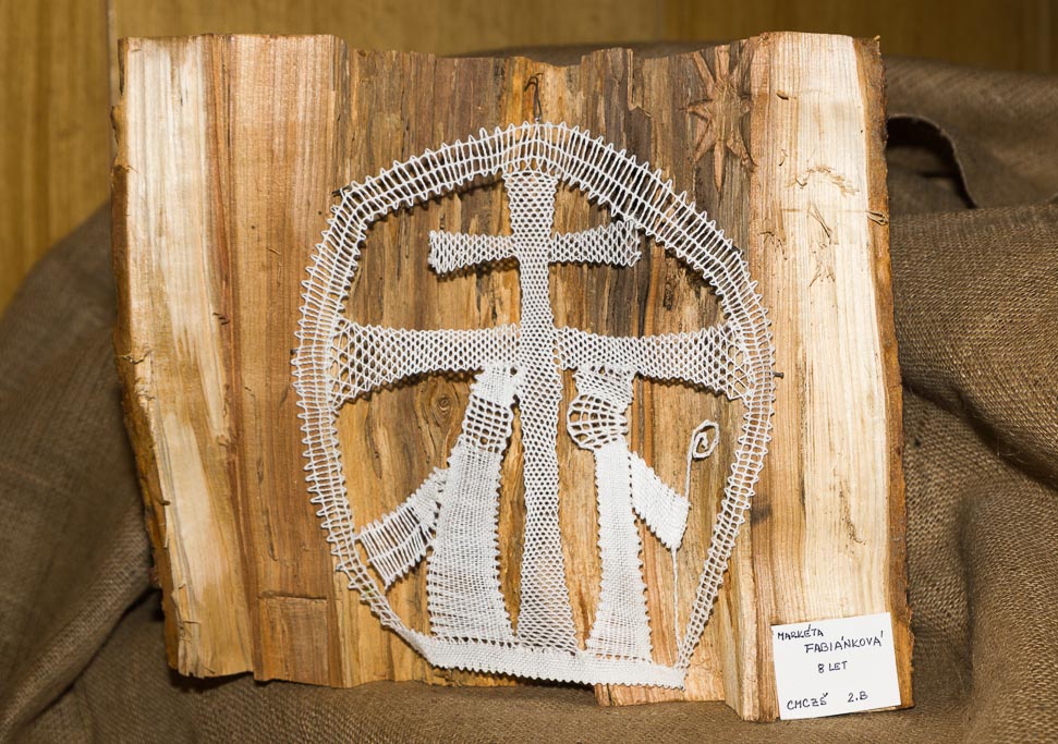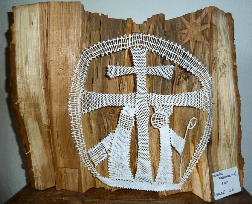 Paličkovaný „Cyril a Metoděj“ byl můj první návrh, který byl zároveň do mé první soutěže. Téma bylo „Barevné štětce pro soluňské světce“, ve kterém se mělo ztvárnit podle vlastní představy svatého Cyrila a Metoděje. Svého svatého „Cyrila a Metoděje“ jsem upaličkovala bílou bavlnkou, kde byl uprostřed kříž z polohodu a po stranách byl svatý Cyril a Metoděj. Oba dva Soluňští bratři, kteří hlásili u nás víru, byli paličkovani plátnem a hlavu měli z krouceného plátna. K tomu jsem ještě udělala, jak Cyril drží v ruce knihu paličkovanou z krouceného plátna a Metoděj, jak zase drží berlu. Okolo dvou Slovanských věrozvěstů a kříže byl upaličkovaný polokruh, který byl opět z krouceného plátna. Celé dílo jsem nazvala „Cyril a Metoděj“ jsem připevnila na dřevěný půlkruhovitý špalek.