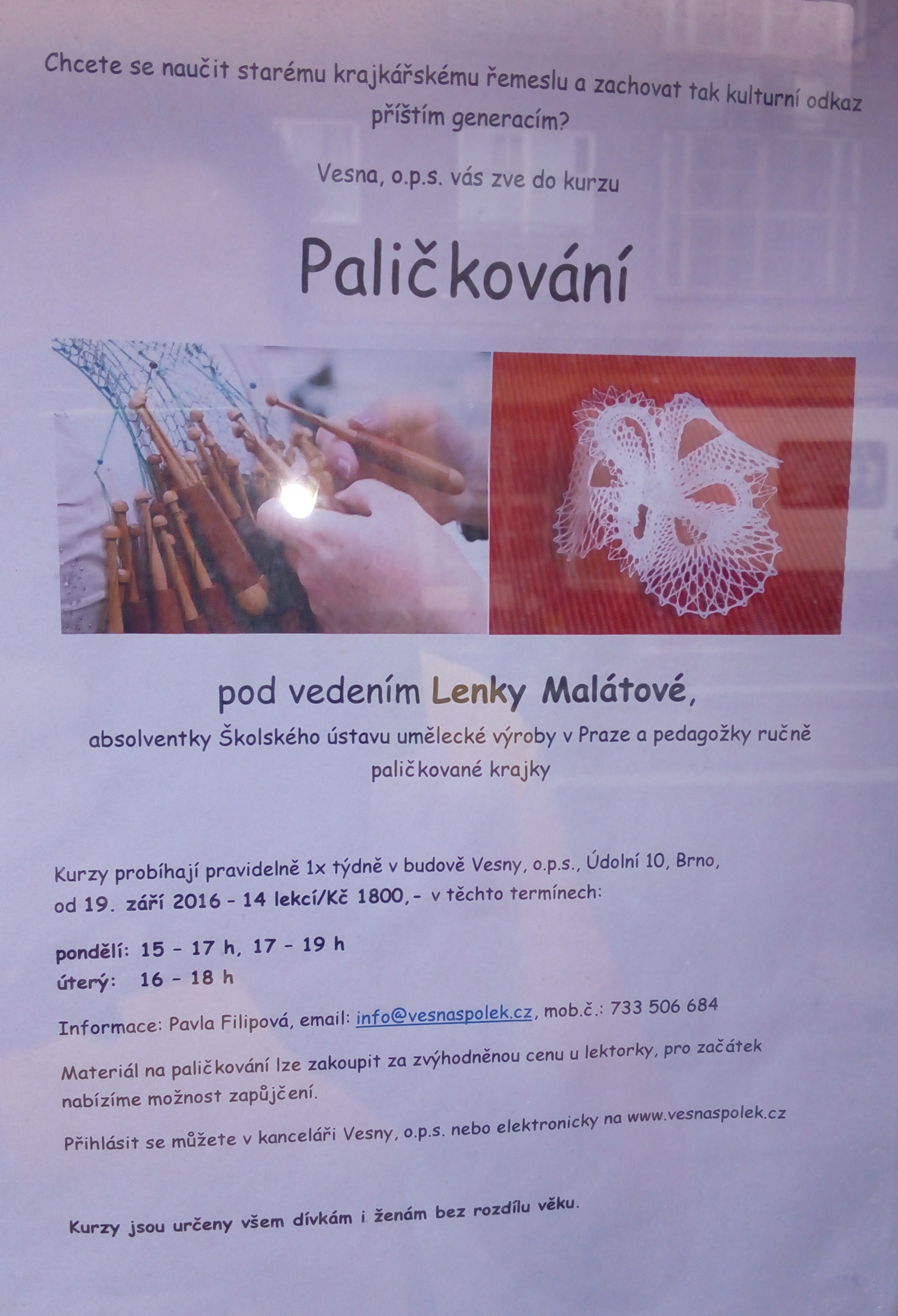 První pokusy paličkování mne nadchly, výrobky z knížky zaujaly, a tak jsem chtěla zkusit něco dalšího než jen pásek a plátnové srdíčko. Jenže tvořit podle knížky už to nešlo tak jednoduše a navíc jsem byla ještě malá a některým pojmům jsem vůbec nerozuměla. Takže nezbylo nic jiného než si najít někoho, kdo by mne to naučil. Naštěstí v Brně vede a učí paličkování Lenka Malátová, další autorka knížek o paličkování. Tak jsem se přihlásila v lednu na druhé pololetí do jejich kurzů paličkování. Od domu jsem to naštěstí neměla daleko, jenom seběhnout kopec a byla jsem tam. V kurzu jsem poznala plno nových lidí, ale bohužel tam nechodily žádné děti.