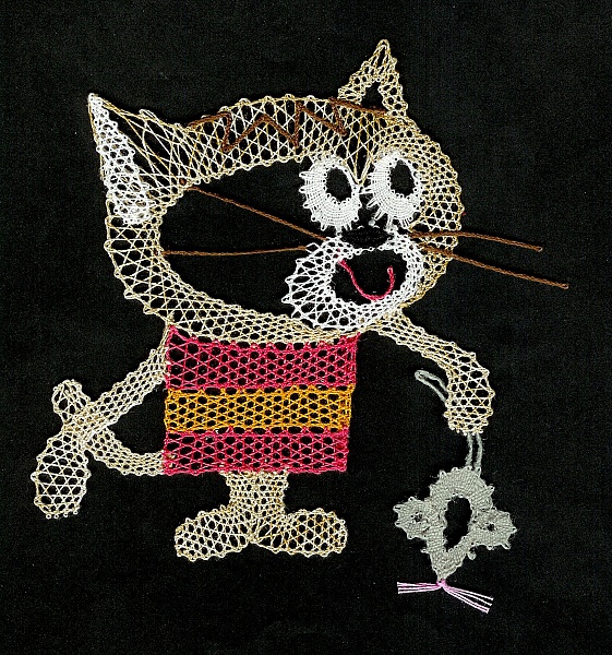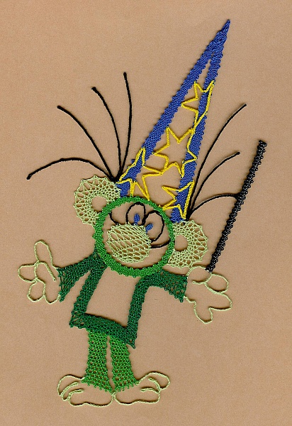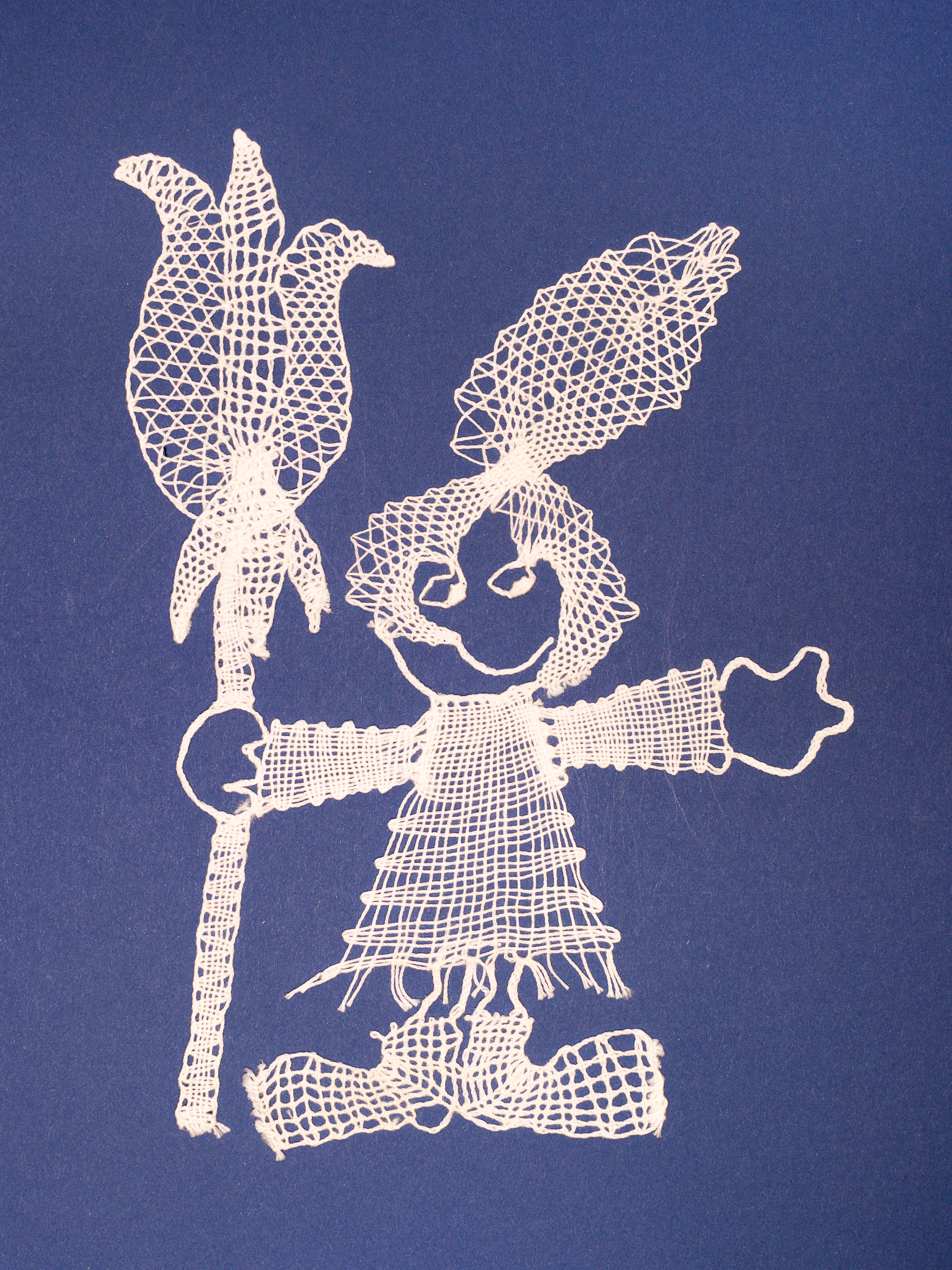 Jelikož mne paličkování bavilo, chtěla jsem zkusit něco více. S mámou jsme našly krajkářskou soutěž pro děti, vyhlášenou spolkem Sedlické krajky. Bylo i pěkné a jednoduché téma a to „Postavičky z večerníčků a pohádek“. Dlouho jsem přemýšlela, kterou postavičku zkusím navrhnout a kde by se daly využít základní vzory plátno a polohod. Nakonec jsem se rozhodla pro Malou čarodějnici. Použila jsem bílou bavlnku a základní vzory tak, aby na tmavém podkladu jednotlivé části čarodějnice vynikly. Hlavně její hrubé plátnové šaty a boty. Jako správná čarodějnice drží v ruce koště.