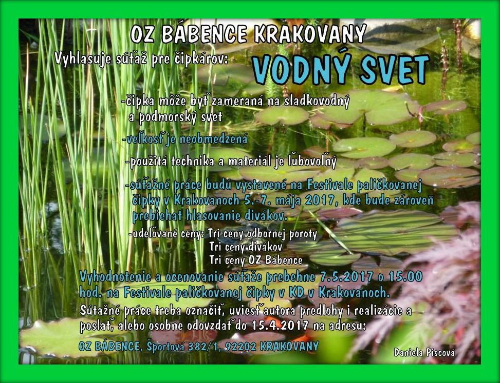 Slovenský krajkářský spolek v Krakovanech vyhlásil 1. ročník soutěže v paličkované krajce na téma „Vodní svět“. Soutěžní práce budou součástí Festivalu paličkované krajky v Krakovanech u Piešťan, který se bude konat 5. – 7. května 2017.