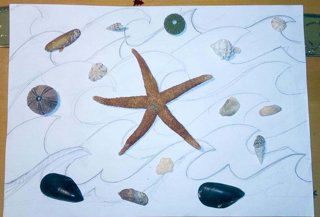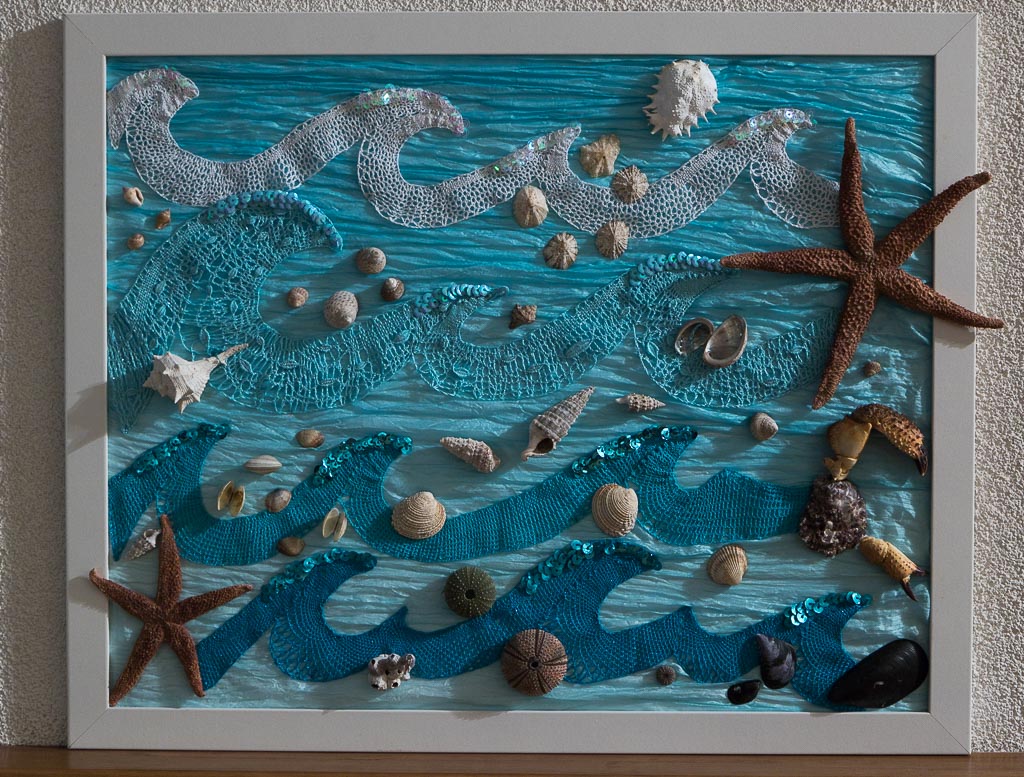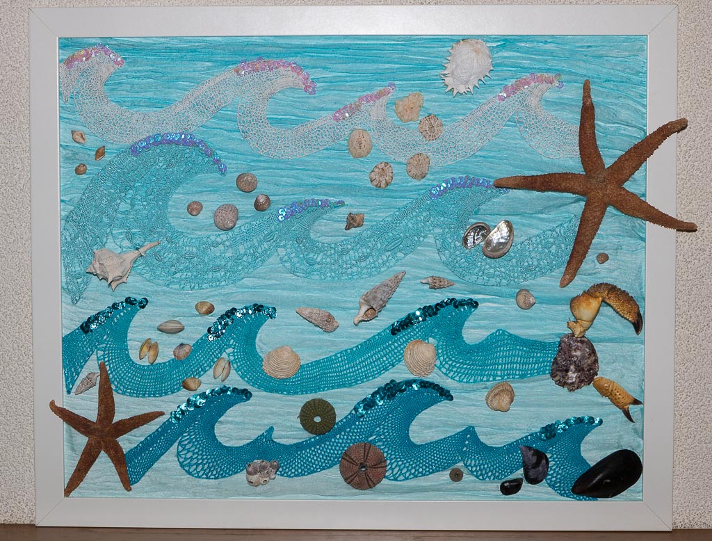 Napadlo mě, že upaličkuji mořské vlny a k nim využiji nasbírané věci od moře, jako jsou mušle, schránky od mořských živočichů, korály, kamínky a hvězdice. Vlny jsem udělala ve čtyřech řadách z různých odstínů modré a bílé perlovky s vloženou modrou metalickou nití. Každou řadu jsem udělala jiným vzorem, všechny vrcholy vln byly zvýrazněny plátnem a flitry, které připomínají mořskou pěnu. Nejspodnější vlna představuje popředí moře, je tedy tmavě modrá a byla upaličkována polohodem. Následující vlna je o odstín světlejší, na kterou bylo použité kroucené plátno. Třetí vlna je světle modrá s využitím nepravidelného krouceného plátna s vloženými lístečky, které připínají rybičky v moři. A poslední vlna je jako by v dálce a je tedy z bílé perlovky se vzorem cuchaniny. Všechny čtyři vlny jsem přišila na světlemodrý hedvábný šátek jako podklad. Mušle, kamínky a hvězdice jsem na podklad přilepila. Vše jsem vložila do bílého rámečku a dílo jsem nazvala „Vzpomínka na moře“, u kterého jsem byla minulé léto poprvé v životě. Hotové dílo jsem odeslala na Slovensko do Krakovan.