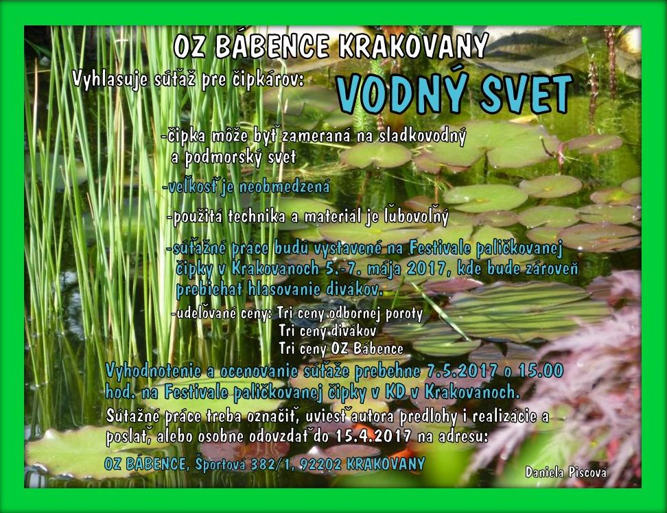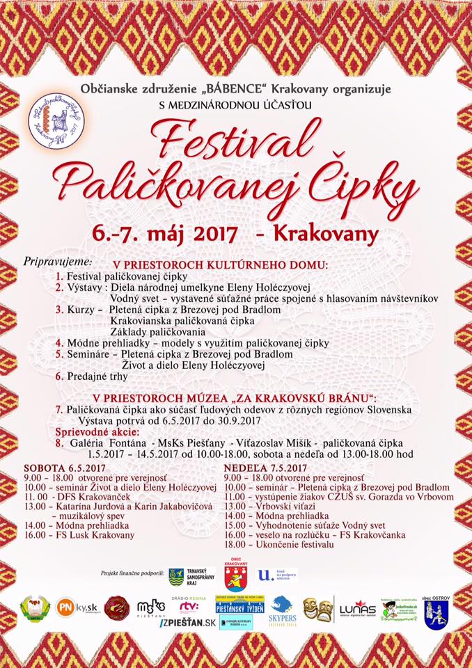 První víkend v květnu se v kulturním domě v Krakovanech na Slovensku konal druhý ročník festivalu paličkované krajky. Krakovany je malé obec, která leží západně od města Piešťany. Do okolí Krakovan jsem jela s rodinou, ale na festivalu jsme byli jenom v neděli, protože jsme si o víkendu hlavně projeli na kole místní nádhernou přírodu.