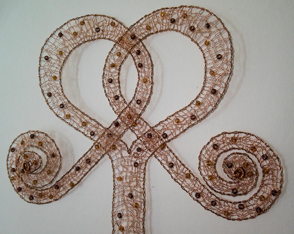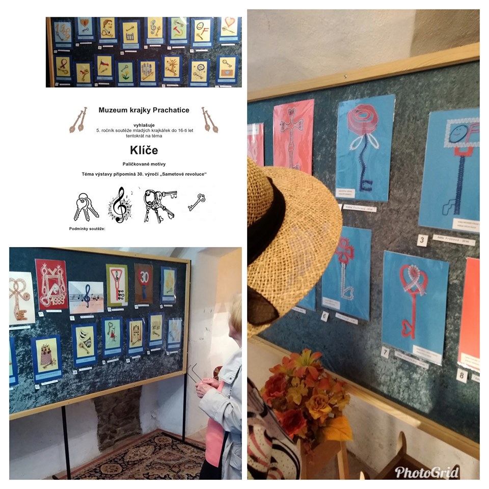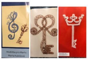 Jako už předchozí roky jsem se rozhodla znovu přispět do soutěže v Prachaticích. Tentokrát bylo téma „Klíče“, který měl připomínat 30. výročí sametové revoluce. Chtěla jsem udělat klasický, ale zdobnější klíč. Tak jsem si ho navrhla a upaličkovala z měděných drátků, protože klíč mívá tuto barvu. Do klíče jsem dala ještě korálky. Klíč má v sobě udělaný houslový klíč, jelikož hudba je také klíčem k srdci lidí. Vršek klíče jsem udělala do tvaru srdce. Srdce je také symbolem Václava Havla, který stál u zrodu sametové revoluce a pak byl prezidentem. Klíč je paličkován cuchaninou, která mu dala pěknou strukturu a na práci s drátkem je vhodná, protože u drátku je znát jeho nerovnost a nepřizpůsobivost. Navíc se drátek velmi špatně přiháčkovává, takže je potřeba s tím počítat a dělat práci jedním tahem bez zbytečných napojení. Tato práce s klíčem dostala svůj název „Klíčení“ až od organizátorů výstavy, a jelikož se mi název líbí, ponechala jsem ho.