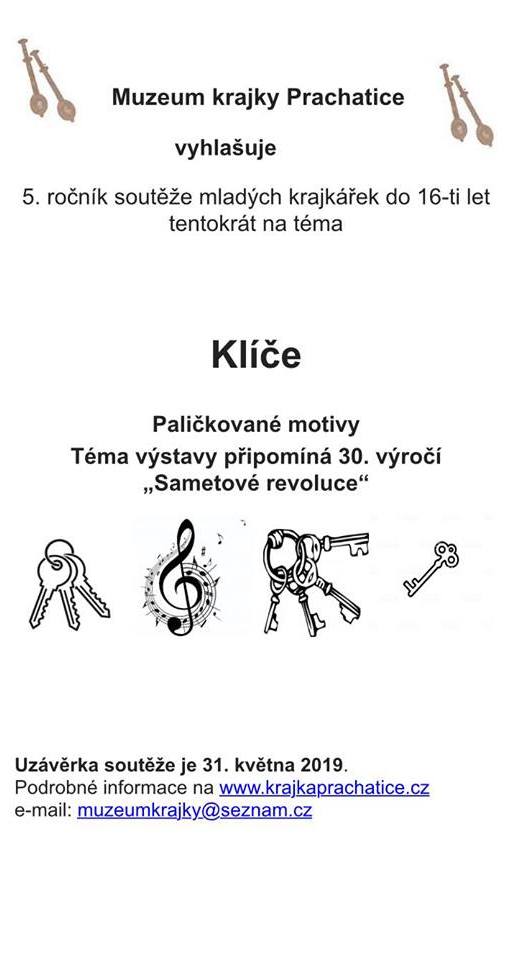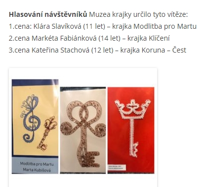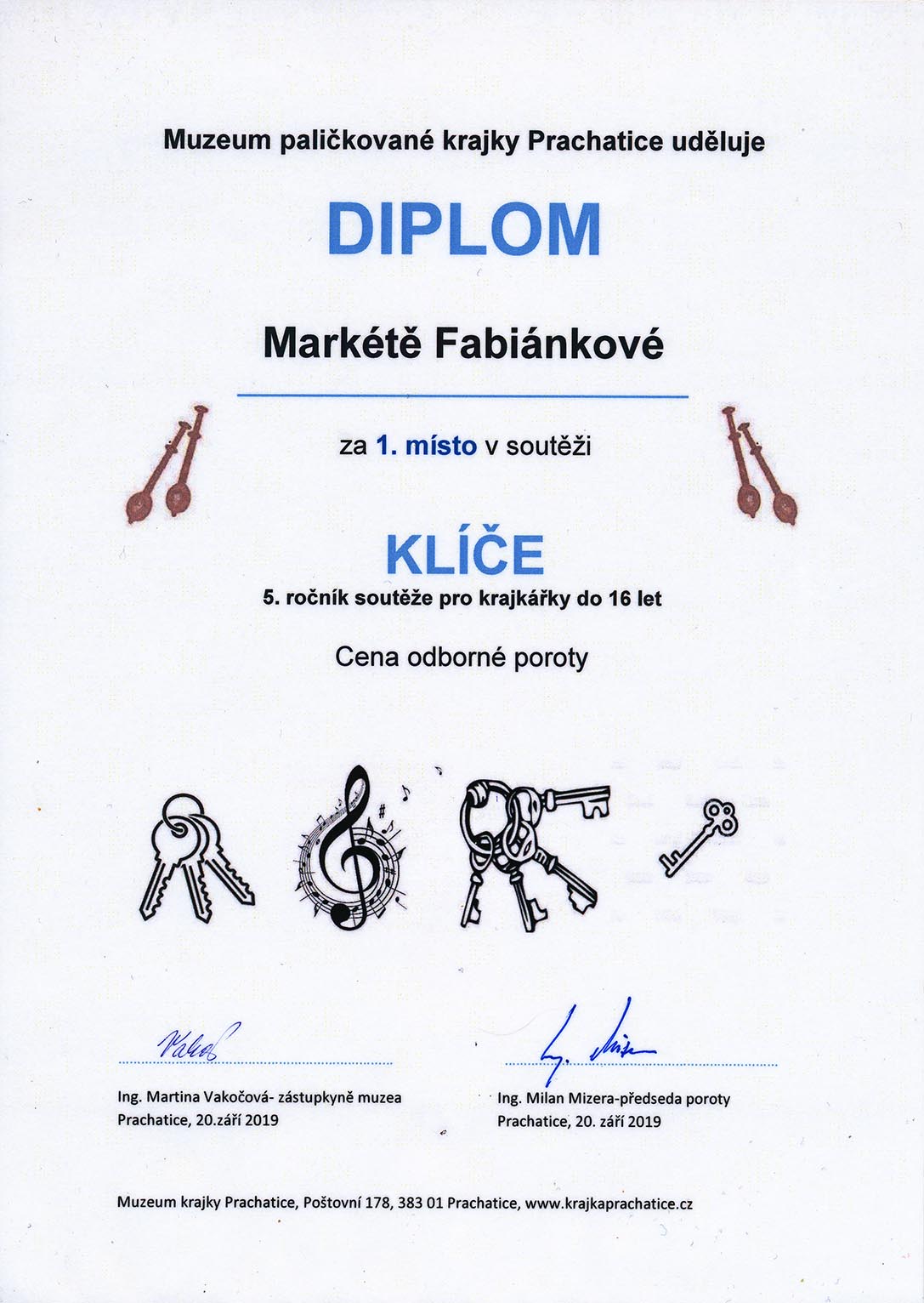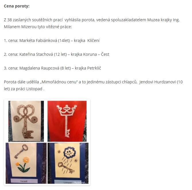 Svůj hotový klíč jsem odeslala poštou do Prachatic a mailem mi došlo potvrzení, že práce dorazila v pořádku a že se soutěže zúčastnilo 38 děl z Česka, ale i ze Slovenska. Jsem ráda, že jsem se mohla opět této soutěže zúčastnit a uvidíme další rok, jestli se zúčastním. Bude to asi naposledy, jelikož soutěž je pouze do 16 let, a mě už následující rok bude tolik.